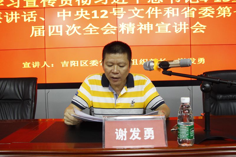 吉陽區(qū)委組織部副部長彭云,區(qū)委組織部有關(guān)負(fù)責(zé)同志,集團(tuán)公司總裁陳云,集團(tuán)公司全體黨員、入黨積極分子30余人聆聽宣講會。