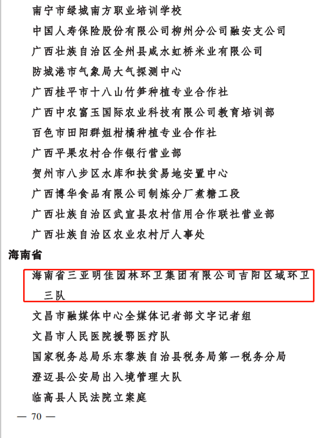 “芬芳三月,如歌巾幗?!痹趹c祝第111個(gè)三八國際勞動?jì)D女節(jié)之際,三亞明佳園林環(huán)衛(wèi)集團(tuán)有限公司吉陽區(qū)域環(huán)衛(wèi)三隊(duì)榮獲2020年度“全國巾幗文明崗”榮譽(yù)稱號?!叭珖韼轿拿鲘彙笔侨珖鴭D女“巾幗建功”活動專設(shè)崗, 是全國婦聯(lián)為表彰積極為國家、為社會、為人民做出突出貢獻(xiàn),取得優(yōu)異的優(yōu)秀婦女團(tuán)體而頒發(fā)的榮譽(yù)稱號。