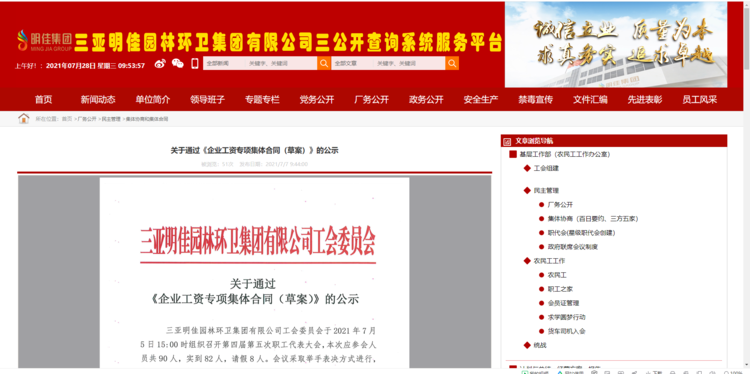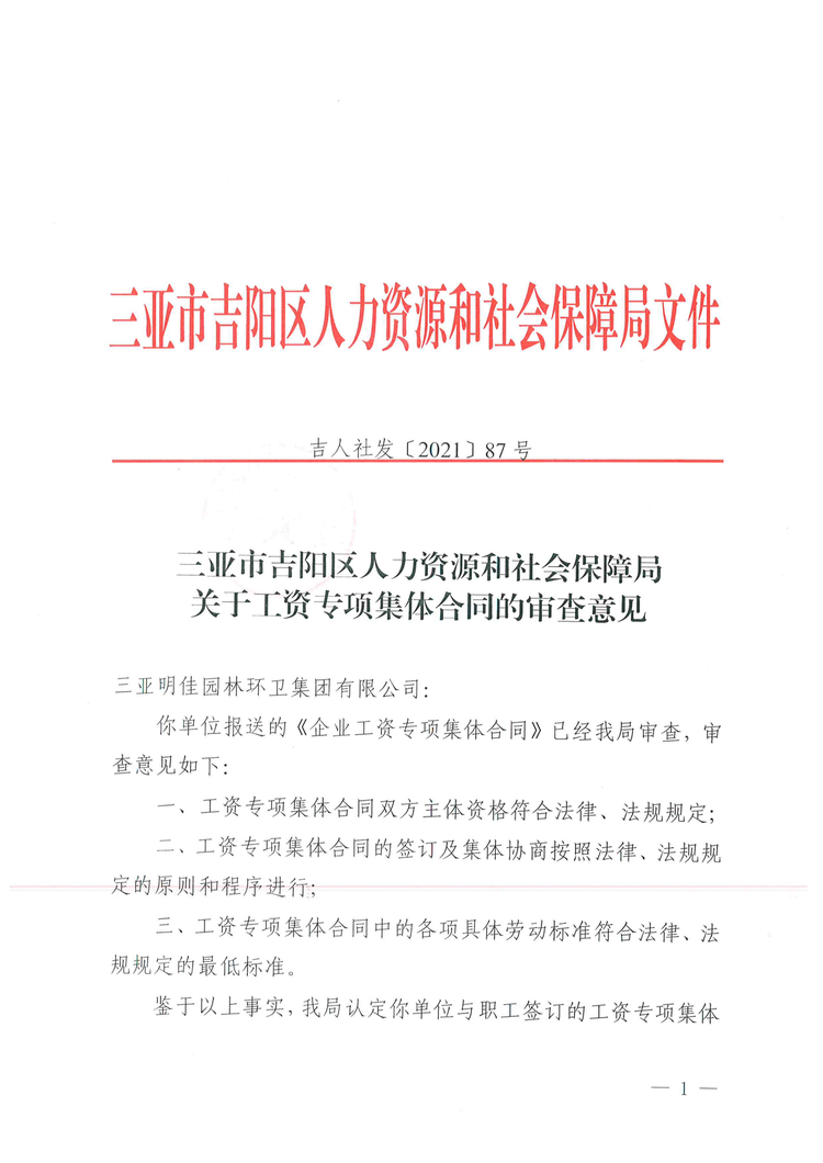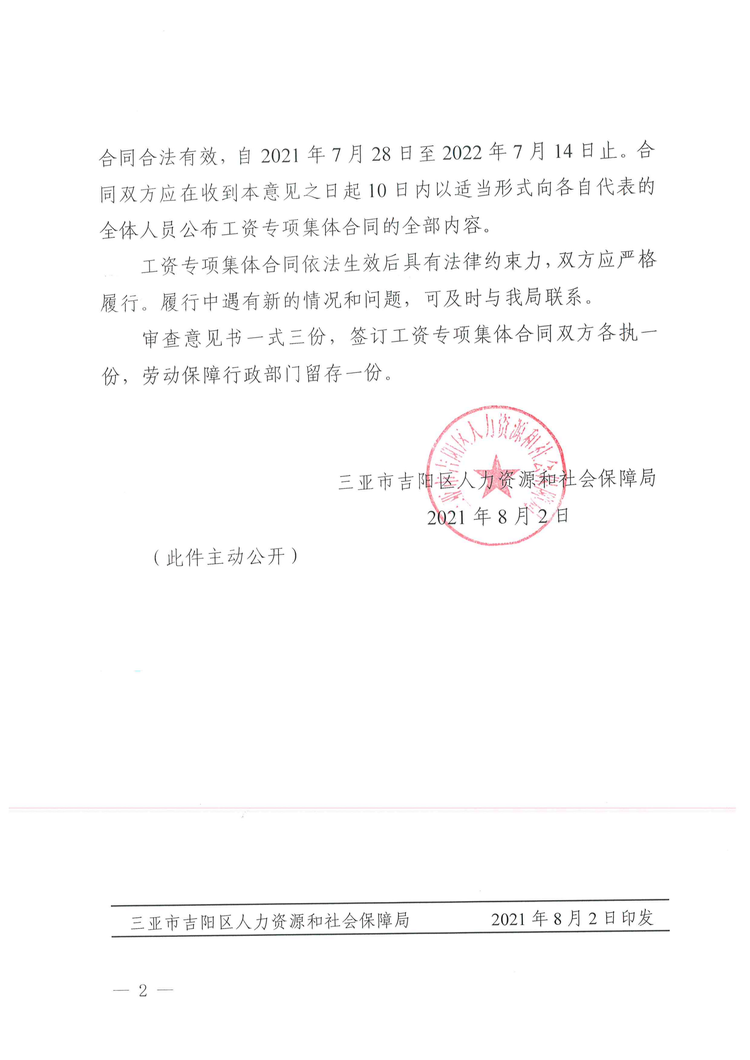 2021年8月2日,吉陽區(qū)人社局審查通過我公司《企業(yè)工資專項集體合同》。8月4日報三亞市總工會基層工作部備案。至此,三亞明佳園林環(huán)衛(wèi)集團有限公司2021年度企業(yè)工資集體協(xié)商工作圓滿結束。