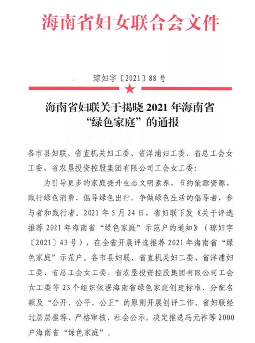 明佳集團吉陽區(qū)域環(huán)衛(wèi)四隊隊長羅福英家庭于2021年10月22日被海南省婦聯(lián)推選為2021年海南省“綠色家庭”示范戶。