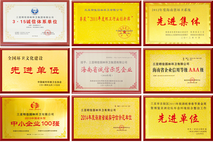 2017年2月1日,分別被三亞市園林環(huán)衛(wèi)局、吉陽區(qū)環(huán)衛(wèi)所、天涯區(qū)城管局、海棠區(qū)城管局及三亞市愛衛(wèi)辦等主管部門評定為“環(huán)境衛(wèi)生先進(jìn)外包企業(yè)”